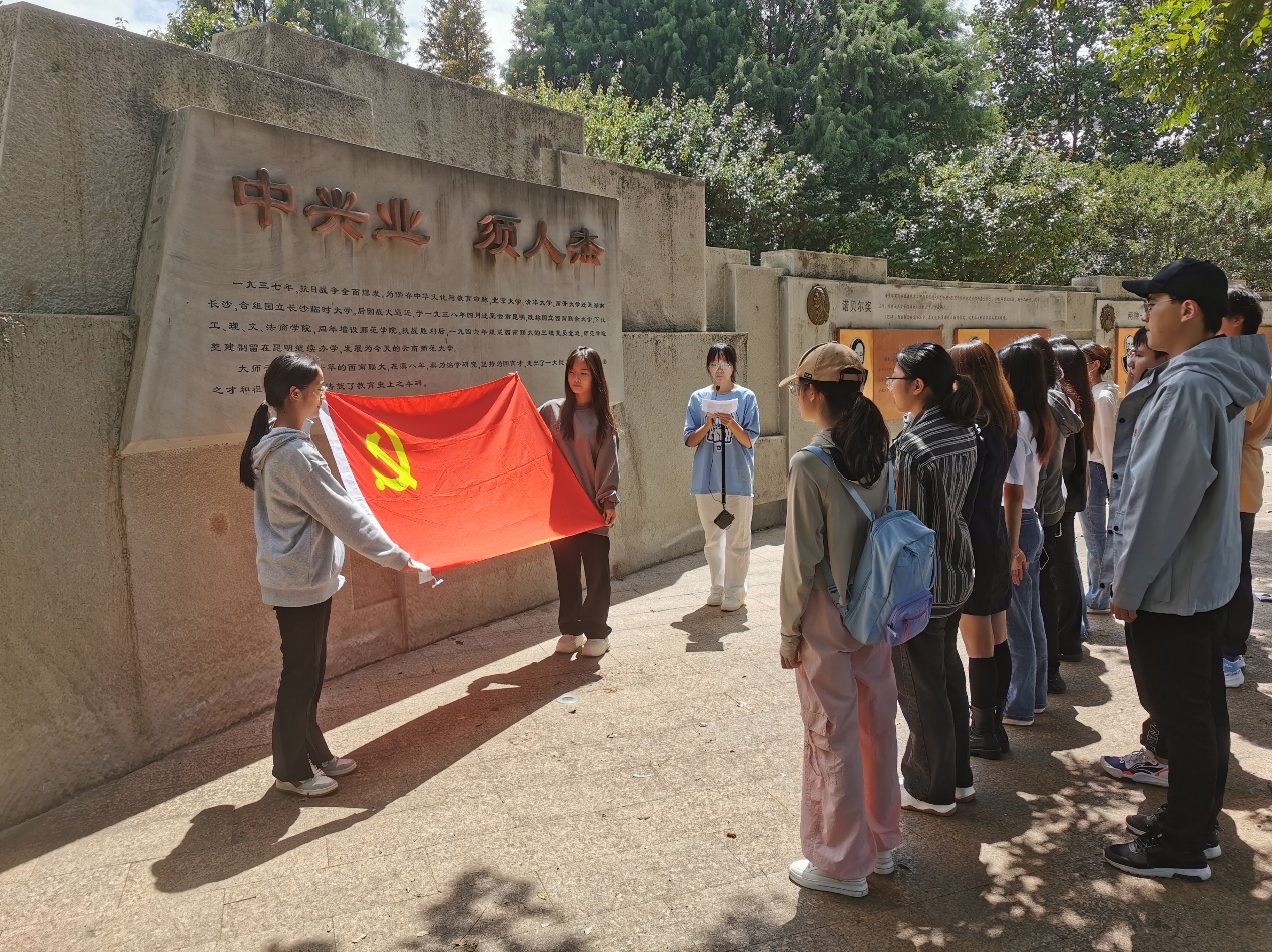 在人杰墙前面全体党员齐声高唱国歌,重温入党誓词。艾洁敏、林如雪、周子娴3位同志从“诺贝尔奖”“两弹一星功勋奖”“国家最高科学技术奖”三个板块带领党员学习西南联大优秀员工的事迹以及精神品质,为同志们带来一场沉浸式党课。党支部书记龚鹏同志对同志们提出要求,要不断深入学习贯彻习近平新时代中国特色社会主义思想,牢记习近平总书记嘱托,以教育家为榜样,树立“躬耕教坛、强国有我”的志向和抱负,秉承"刚毅坚卓"校训,向先辈看齐,传承西南联大教育救国精神。