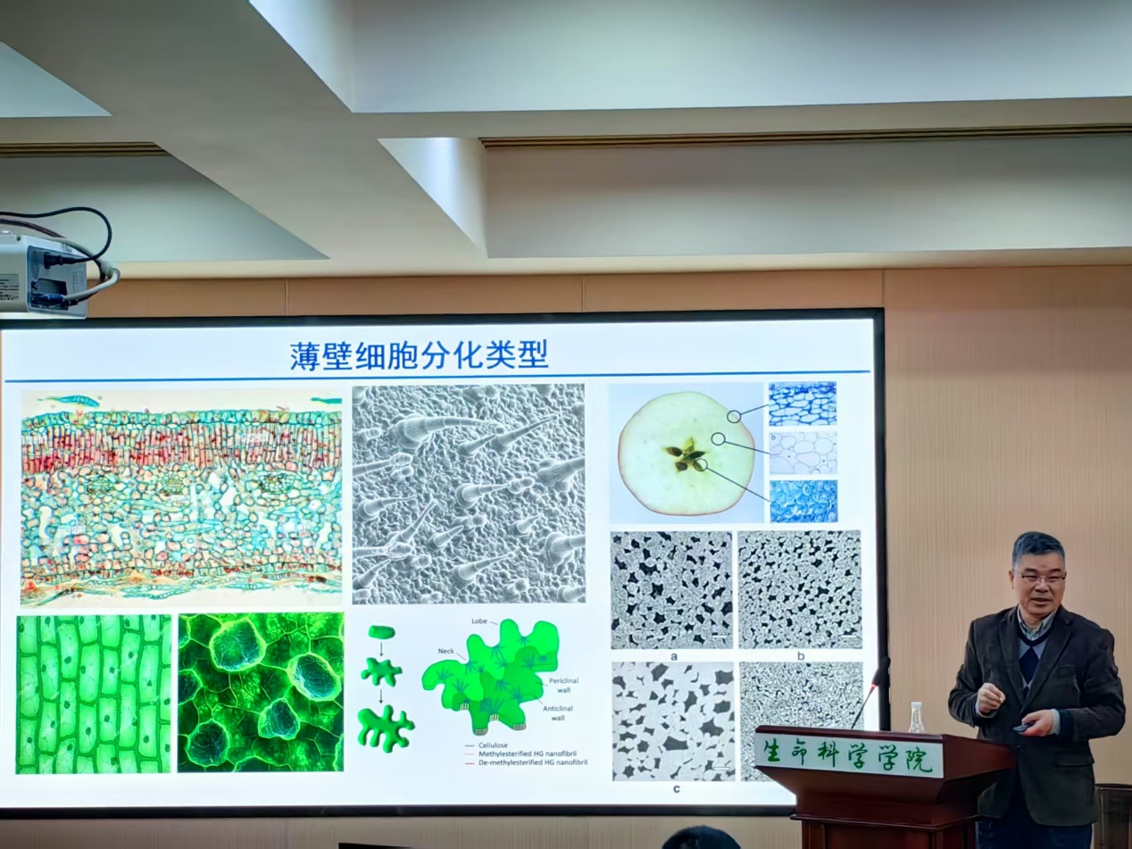 李来庚研究员深入浅出地介绍了植物细胞壁薄壁细胞分化类型,通过生动的实例和直观的图表,让在场师生对这一基础概念有了清晰的认识。随后,他详细阐述了细胞壁加厚分化类型,剖析了其背后的生理机制和生物学意义,引发了大家对植物细胞壁多样性和复杂性的深入思考。