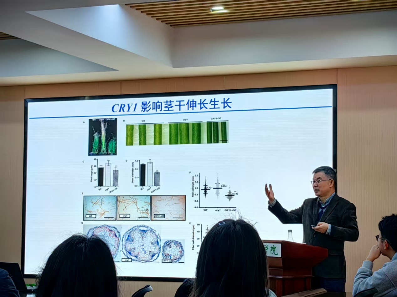 在讲解细胞壁形成的多层级的转录调控网络时,李来庚研究员更是凭借其扎实的专业功底和丰富的研究经验,将错综复杂的调控关系梳理得井井有条。他以AtVRLK1基因为例,深入探讨了该基因如何影响花粉从花药中释放,以及其在花药药室内壁细胞壁加厚过程中的关键作用,进一步阐述了AtVRLK1协调细胞伸长与细胞壁加厚的调控机制。这一部分内容不仅展现了植物细胞壁研究的前沿进展,也为作物遗传改良提供了新的思路和方向。