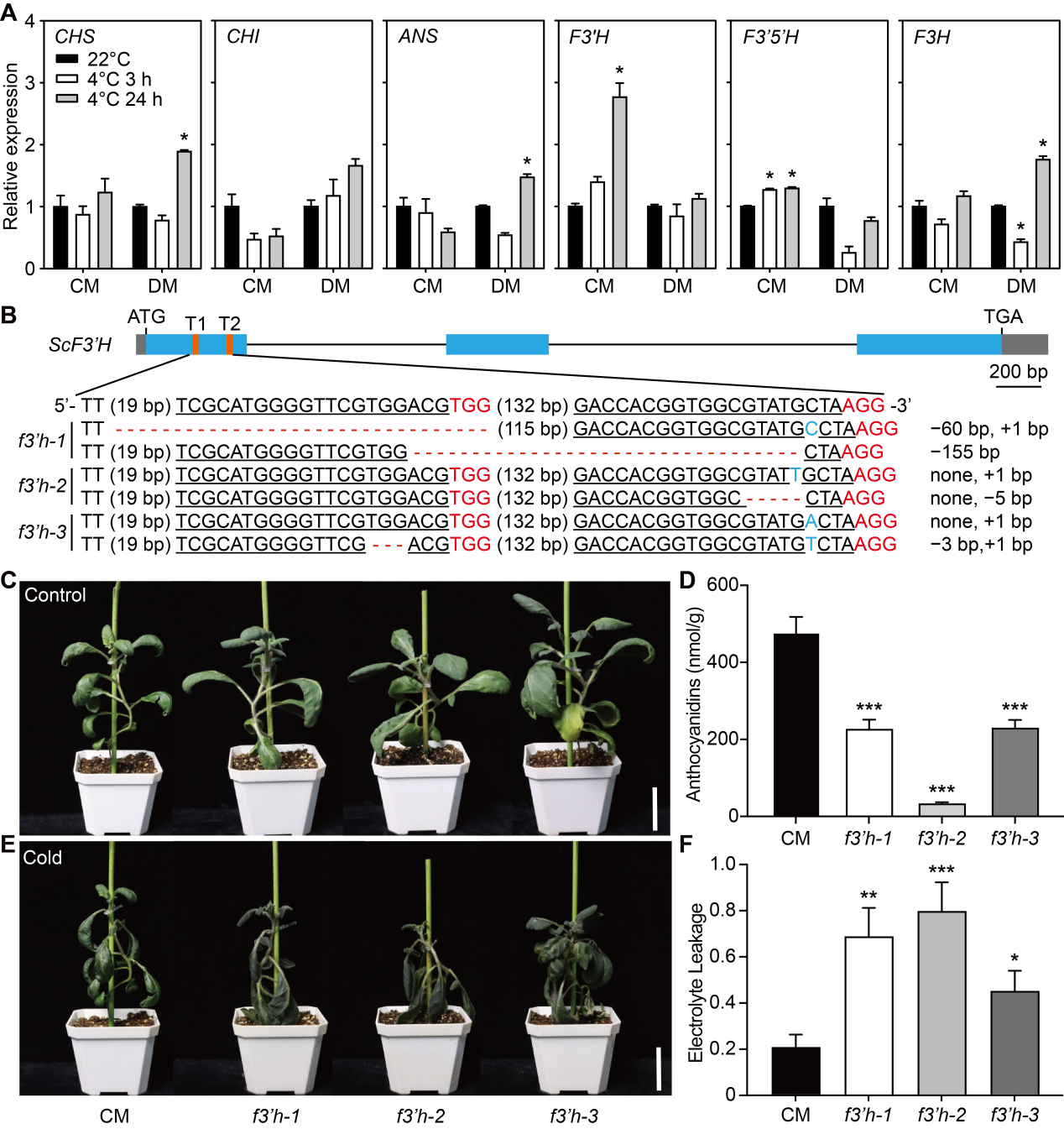 低温诱导耐寒野生马铃薯S. commersonii中ScF3’H的表达。通过CRISPR/Cas9基因编辑技术创制了ScF3’H功能缺失突变体,f3’h突变体的花青素含量显著低于CM,且比CM对低温胁迫更加敏感,这些结果表明ScF3’H正调控CM的低温耐受性(图1)。