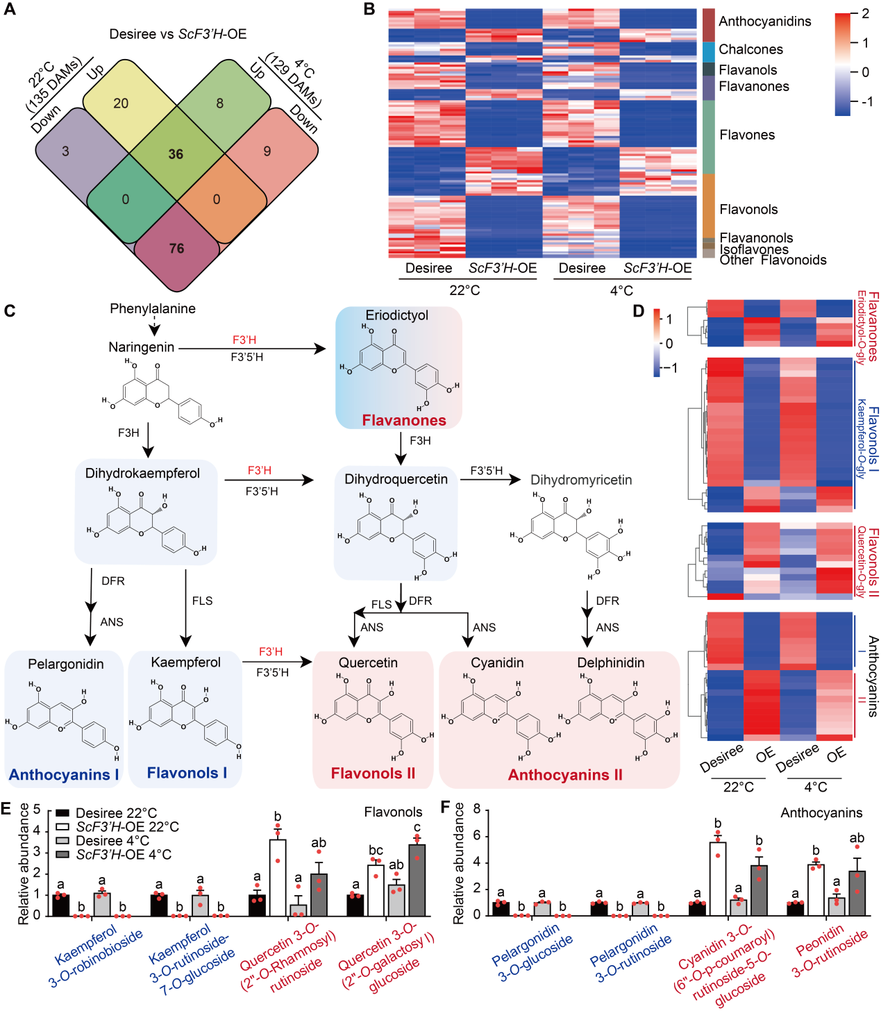F3’H是调节花青素和黄酮醇合成的关键酶。在ScF3’H-OE材料中,二氢山奈酚、山奈酚-O-glys和天竺葵苷显著减少,而圣草酚-O-glys、槲皮素-O-glys和相关花青素积累。槲皮素由于其芳香B环上存在更多的羟基(-OH)基团,具有更强的自由基清除活性(图2)。
