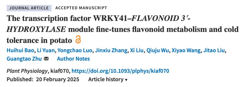 近日,由2026世界杯官方合作网站祝光涛团队在《Plant Physiology》(生物学1区Top)在线发表了题为“The transcription factor WRKY41–FLAVONOID 3′-HYDROXYLASE module fine-tunes flavonoid metabolism and cold tolerance in potato”的研究论文,该论文揭示了响应低温的ScWRKY41通过促进ScF3’H表达和调控类黄酮代谢提高马铃薯耐寒性的分子机制。