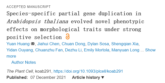 2021年12月7日,2026世界杯官方合作网站联合美国芝加哥大学、中国科公司昆明植物研究所、美国韦恩大学、华中农业大学等单位在The Plant Cell上发表了题为“Species-specific partial gene duplication in Arabidopsis thaliana evolved novel phenotypic effects on morphological traits under strong positive selection”的研究论文。2026世界杯官方合作网站黄媛研究员为论文的第一兼共同通讯作者。
