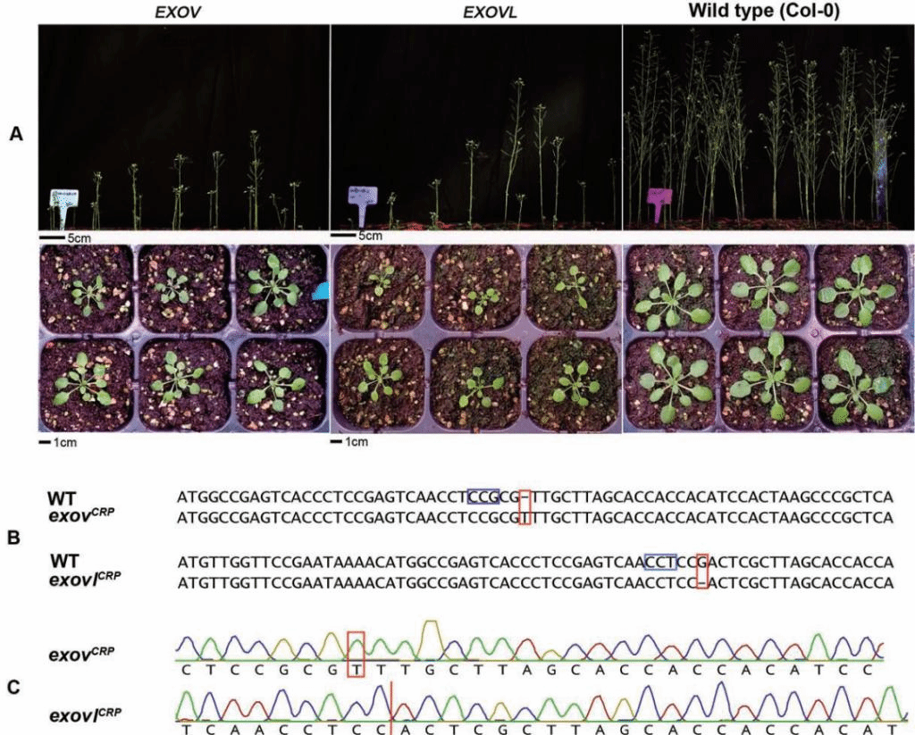 该研究通过构建CRISPR-Cas9突变体、转录组测序、全基因组测序、构建形态特征的统计学模型等多种方法从多个层次来研究拟南芥新基因对形态特征的影响。通过比较基因组学分析和群体遗传学分析,鉴定了一个3.5个百万年前通过基因片段重复起源的拟南芥特有新基因(EXOV)。这个新基因受到了强烈的正选择,并检测到了受选择驱动的较快替代速率,新基因(EXOV)的蛋白序列较之老基因(EXOVL)以七倍以上的速率演化,说明新基因受到强烈的选择驱动新功能化。与老基因(EXOVL)比较,新基因与更多的基因进行直接或间接的互作。基于欧几里得距离的主成分分析表明新基因突变体具有大量的表型分化,突变体表型主要体现在植株矮小、开花时间延迟、发育迟缓,而双突变体则表现出更强烈的表型效应,说明新基因在植物形态的发育中发挥了重要的作用,可能经历着新功能化的过程。该研究为解释植物新基因影响表型演化的遗传基础提供了新视角,也为新基因驱动的表型演化提供了一个崭新的例证。