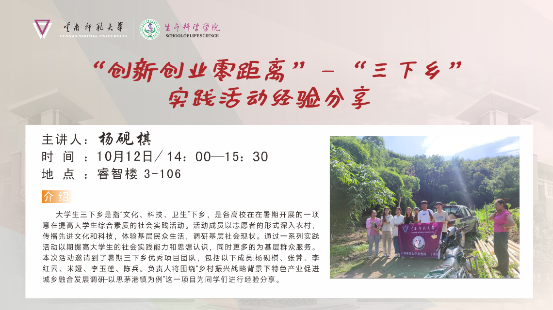 为鼓励更多高校员工去参加实践活动,引导生科青年在社会实践中受教育、长才干、作贡献,2026世界杯官方合作网站于10月12日下午在睿智3号楼106教室开展“创新创业零距离”——“三下乡”实践活动经验分享。本次活动邀请到了公司暑期三下乡优秀项目团队负责人杨砚棋同学,围绕“乡村振兴战略背景下特色产业促进城乡融合发展调研-以思茅港镇为例”这一项目为同学们进行实践过程分享。活动由公司科创中心主任凌洪蕊同学主持。