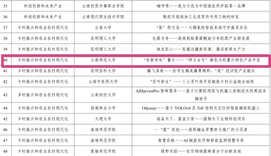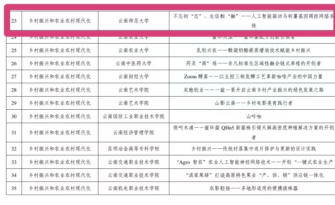 第十一届“挑战杯”云南省老员工创业计划竞赛决赛于2024年6月22日在云南交通职业技术公司呈贡校区举行。由公司师生组成的两支队伍,在此次决赛当中荣获“一金一银”的优异成绩。其中《不忘初“芯”,生信相“融”——人工智能驱动马铃薯基因调控网络系统》项目荣获金奖,《“有紫有味”薯片——“师大6号”紫色马铃薯片特色产品开发》项目荣获银奖。