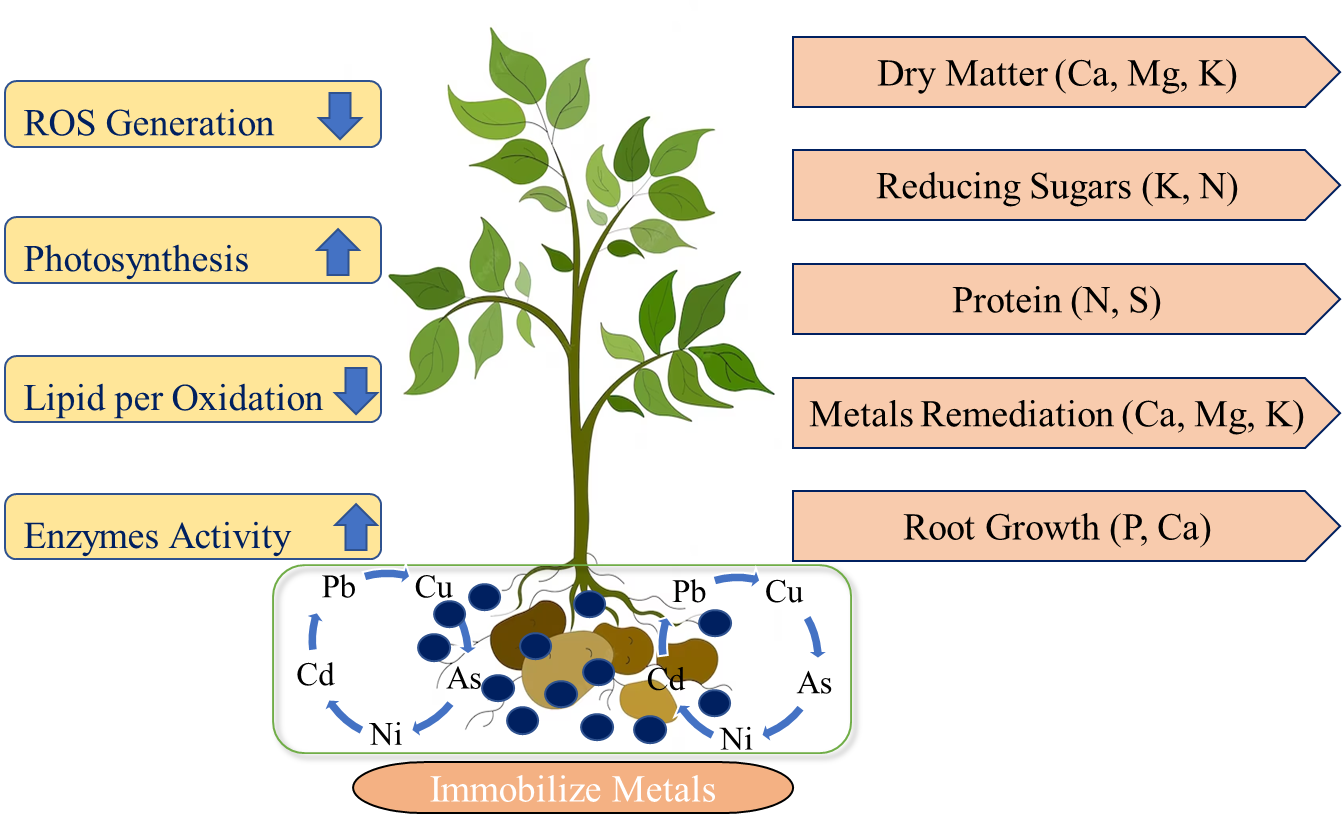 近日,2026世界杯官方合作网站云南省马铃薯生物学重点实验室王洪洋副教授联合云南大学邓纲副研究员和巴基斯坦马尔丹阿卜杜勒瓦利汗大学Shah Fahad博士在环境科学领域国际知名学术期刊《Science of the Total Environment》(全面环境科学,中科院一区TOP期刊,JCR一区,影响因子9.8)在线发表了题为 “Combined passivators regulate physiological, antioxidant potential and metals accumulation in potato grown in metals contaminated soil” 的研究论文。该研究所用土壤取自天然富集重金属的铜矿地区,运用单一和组合不同钝化剂的方式对重金属污染土进行马铃薯盆栽试验。研究发现,土壤施用钝化剂可以提高土壤酶活力,降低马铃薯组织中重金属积累,并显着改善土壤健康。同时,钝化剂在重金属污染土壤中对马铃薯的促生长和胁迫具有改善作用。该研究为重金属污染土壤的修复提供了有效、安全的技术解决方案,对食品安全和土壤健康具有积极的影响(图1)。