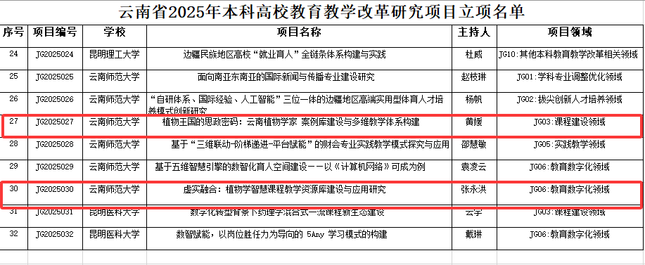 黄媛教授长期致力于课程建设领域的研究与实践,此次立项的项目聚焦于植物学等课程体系的优化与创新。张永洪教授的研究领域为教学数字化,其立项项目紧扣当前教育信息化的发展趋势,推动植物学等教学资源的数字化建设,开发适应数字化教学的平台与工具,探索数字化环境下的教学模式创新。