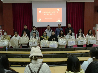 周滔老师代表公司向同学们致以亲切的冬日慰问,详细询问了大家的学习生活状况,叮嘱同学们注意防寒保暖,照顾好自身健康。同时,他鼓励同学们在寒冬时节依然要保持积极向上的精神风貌,专注学业、奋发图强,在成长道路上勇攀高峰,不辜负公司的殷切期望。员工代表在温馨有序的氛围中,依次领取暖冬三件套礼包。这份满载公司关怀的礼包,不仅为同学们带来了冬日的暖意,更让大家感受到了公司大家庭的温暖与凝聚力。同学们纷纷表示,将把这份关怀转化为学习的动力,以更饱满的热情投入到后续的学习和生活中。