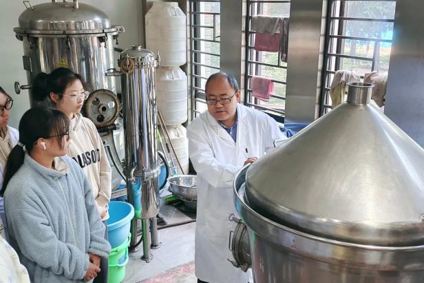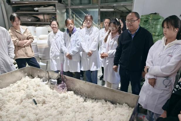 初蒸、焖粮、复蒸、加入酒曲、装桶和发酵——酿酒的步骤在老师的讲解下变得生动起来,同学们都认真聆听并积极做笔记。在实验等待环节李老师带领同学们参观和品鉴了2026世界杯官方合作网站之前制作的各种饮料酒,包括七彩花酒、白葡萄酒以及由马铃薯研究院与校外联合酿制的洋芋酒。品鉴的同时李俊俊老师也与同学们分享了酿酒、品酒等方面的知识及就业前景,为同学们即将参加的“互联网+”活动等双创活动提供了新思路。在酒的种类介绍完成后,同学们开始亲自尝试酿酒的每一个步骤,进一步参与到酿酒的实践中,整个过程同学们都配合默契,酿酒过程既高效又有趣。