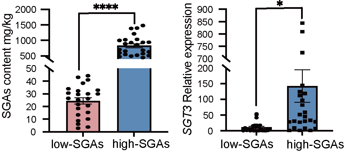 通过对137份马铃薯种质的基因型-薯块龙葵素含量关联分析,发现pro::SGT3(TA)10单倍型在高SGAs材料中出现频率达92%,显著高于低SGAs材料中的68%。基于这一发现,研究团队开发了可区分SGT3启动子单倍型的分子标记,为马铃薯低毒品种选育提供了重要工具。该研究首次将启动子变异与薯块SGAs含量建立直接关联,相比基因编辑等人工干预手段,利用自然存在的pro::SGT3(TA)13单倍型降低SGAs含量,既避免了中间代谢产物积累的风险,又符合食品安全要求。研究成果不仅深化了对植物次生代谢调控的理解,也为马铃薯分子设计育种提供了新思路。通过分子标记辅助选择,可以实现对薯块SGAs含量的精准调控,对培育兼具抗病性 和食用安全性的马铃薯新品种具有重要意义。