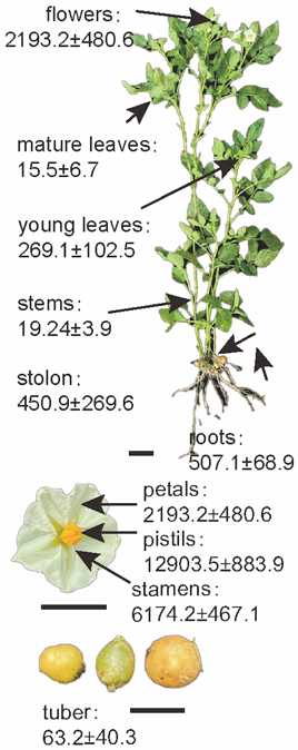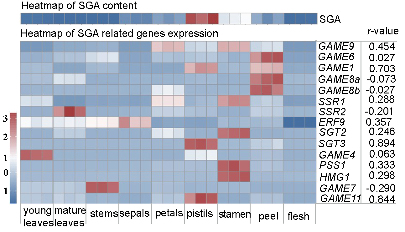 该研究以二倍体马铃薯自交系E4-63为材料,将E4-63各组织中龙葵素含量与龙葵素合成基因的表达量进行相关性分析,发现SGT3基因表达量与龙葵素含量呈极显著正相关(r=0.894),其编码的糖基转移酶催化了龙葵素生物合成的最后一步。