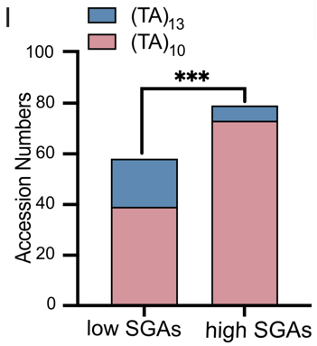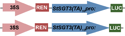 深入研究发现,在SGT3基因启动子区存在TATA-box重复序列的自然变异,形成 (TA)10和 (TA)13两种单倍型。通过双荧光素酶报告系统等实验证实,pro::SGT3(TA)10的启动子活性显著高于pro::SGT3(TA)13单倍型的,从而导致SGT3基因表达量增加和SGAs积累升高。