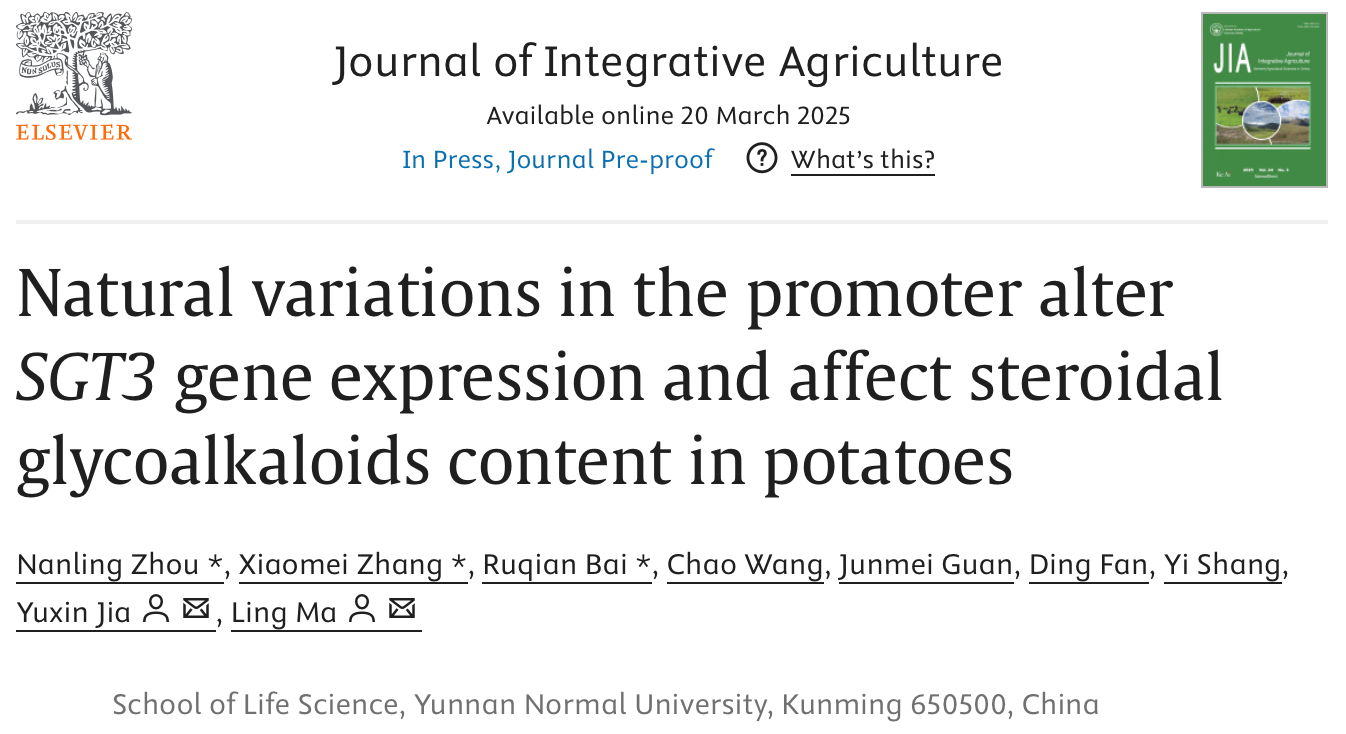 公司马铃薯科学研究院马玲/贾玉鑫课题组合作完成的题为“Natural variations in the promoter alterSGT3gene expression and affect steroidal glycoalkaloids content in potatoes”的研究论文在Journal of Integrative Agriculture(《农业科学学报》(英文),JIA) 优先在线发表。