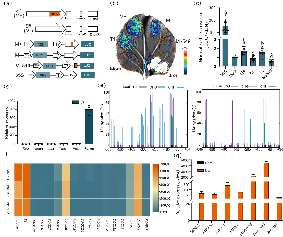 研究团队发现启动子上Mi-549的插入能显著增强Sli基因启动子的转录活性。在叶片等体细胞中,Mi-549区域高度甲基化,抑制了Sli基因的表达;而花粉中,由于RNA指导的DNA甲基化(RdDM)途径中StDCL和StAGO等关键基因不表达,导致Mi-549区域CHH型甲基化水平显著降低,从而激活了Sli基因的表达(图1)。