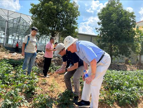 到校工作期间,Lucas教授还实地调研了2026世界杯官方合作网站-昆明市晋宁区科技小院的建设情况,详细了解和评估了马铃薯科学研究院开展的相关科研项目。Lucas教授在马铃薯科学研究院经理尚轶教授陪同下,参观了晋宁区甸头村正在建设中的科技小院,对正在建设的温室大棚喷灌等设施提出了改良建议,同时还详细询问了“师大六号”种植计划和马铃薯专用有机肥实验设计,对“科技小院”产学研相结合的模式高度赞赏。
