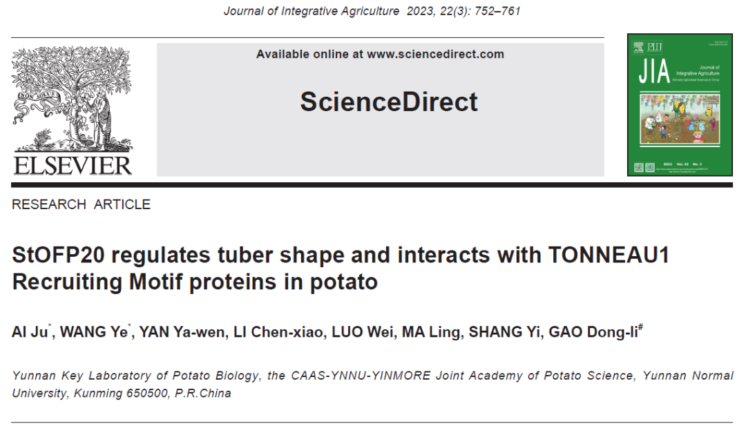 近期,云南师范大学马铃薯科学研究院高冬丽副研究员课题组在Journal of Integrative Agriculture (《农业科学学报》(英文),JIA) 发表了题为“StOFP20 regulates tuber shape and interacts with TONNEAU1 Recruiting Motif proteins in potato”的研究论文。