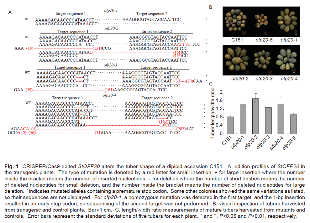 马铃薯是世界上最重要的粮食作物之一,其薯形直接影响马铃薯的外观品质和经济价值。之前的研究表明,StOFP20与表型共分离,但缺乏基因功能验证证据,同时其调控机制尚不清楚。该研究将携带有StOFP20的CRISPR-Cas9敲除载体转化到C151中,获得了4株转基因植株。C151的薯形是圆形的,其长宽比小于1,敲除植株的薯形由圆形变为长椭圆形,其长宽比均大于1。利用酵母双杂交和荧光素酶互补实验,鉴定了与StOFP20互作的3个TONNEAU1 Recruiting Motif (TRM) 蛋白。StOFP20中的OVATE结构域是蛋白互作必需的,TRM中的M10结构域对于StOFP20与TRM19、StOFP20与TRM20蛋白间互作是必需的,缺失M10结构域则不影响StOFP20与TRM5的蛋白互作。研究论文进一步利用酵母双杂交技术鉴定了与3个TRM蛋白互作的TONNEAU (TON) 蛋白。该研究证实了StOFP20控制薯形的生物学功能,初步揭示了其调控机理。