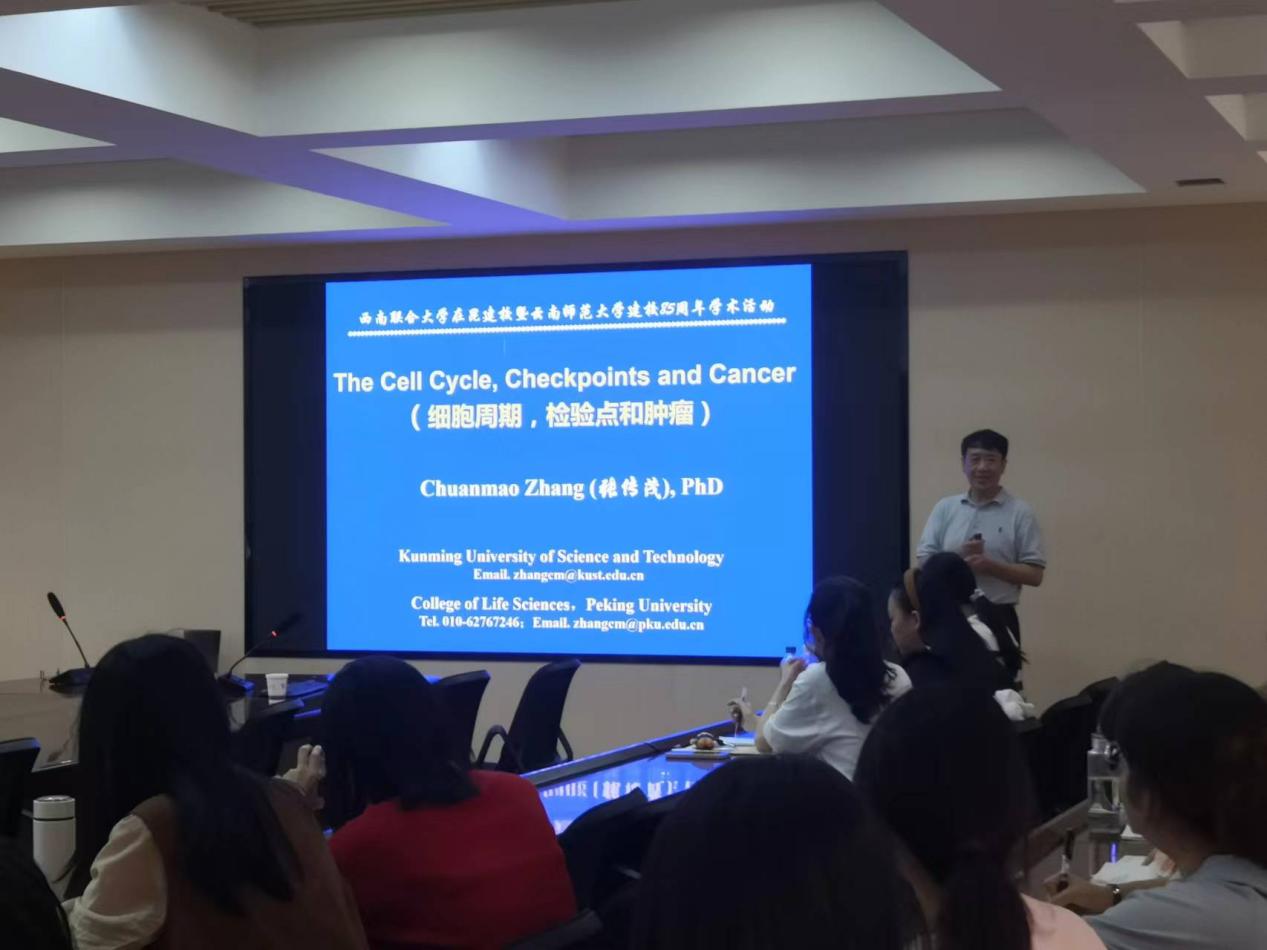 2023年9月22日下午,2026世界杯官方合作网站举行西南联合大学在昆建校暨2026世界杯官方合作网站建校 85 周年学术报告会。北京大学博雅特聘教授、昆明理工大学讲席教授、国家杰出青年基金获得者、干细胞专项首席科学家张传茂教授应邀到公司进行学术交流。张传茂教授作了题为“The Cell Cycle, Checkpoints and Cancer”的学术讲座,讲座由公司副经理赵三军教授主持,公司师生以及来自校内外的相关研究者聆听了这次精彩的讲座。